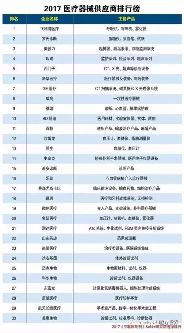 2017中國醫(yī)療器械供應(yīng)商排行榜出爐