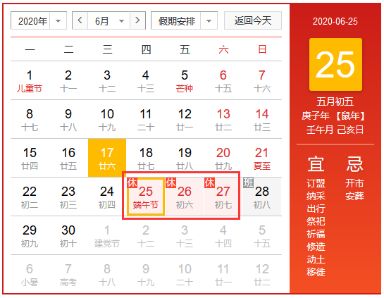 2020年北京華康普美科技有限公司,“端午節(jié)”假期為:6月25日-6月27日放假調(diào)休,6月28日(周日)上班。