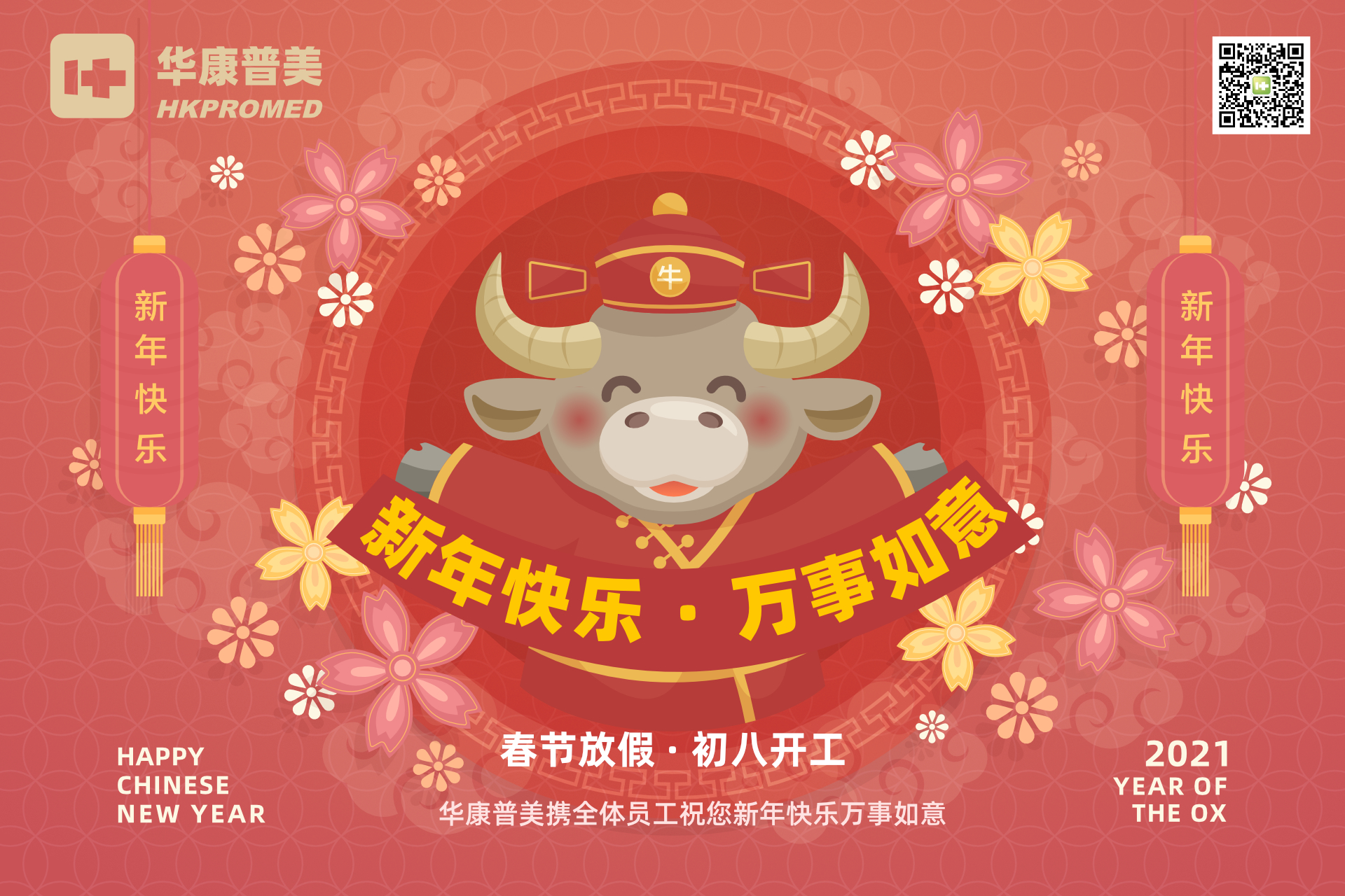 2021年春節(jié)在即,感謝各位醫(yī)院用戶,及醫(yī)療器械經(jīng)銷商長(zhǎng)期以來對(duì)北京華康普美的支持與厚愛!向您致以最誠(chéng)摯的祝福和問候北京華康普美全體員工提前給各位拜個(gè)早年!在牛氣沖天的新年里,祝您牛轉(zhuǎn)乾坤,牛運(yùn)當(dāng)頭