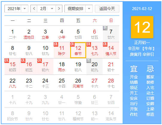 根據(jù)國(guó)務(wù)院辦公廳通知,2021年春節(jié)放假安排如下:2月11日(星期四、農(nóng)歷除夕)至2月17日(星期三)放假調(diào)休,共7天。2月7日(星期日)、2月20日(星期六)上班。