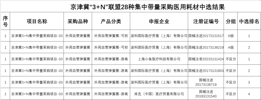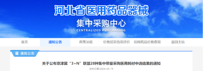 4月19日,河北省醫用藥品器械集中采購中心發布《關于公布京津冀“3+N”聯盟28種集中帶量采購醫用耗材中選結果的通知》。