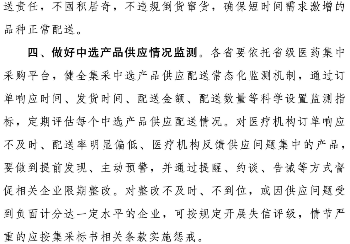 對整改不及時、不到位,或因供應問題受到負面計分達一定水平的企業,可按規定開展失信評級,情節嚴重的應按集采標書相關條款實施懲戒。