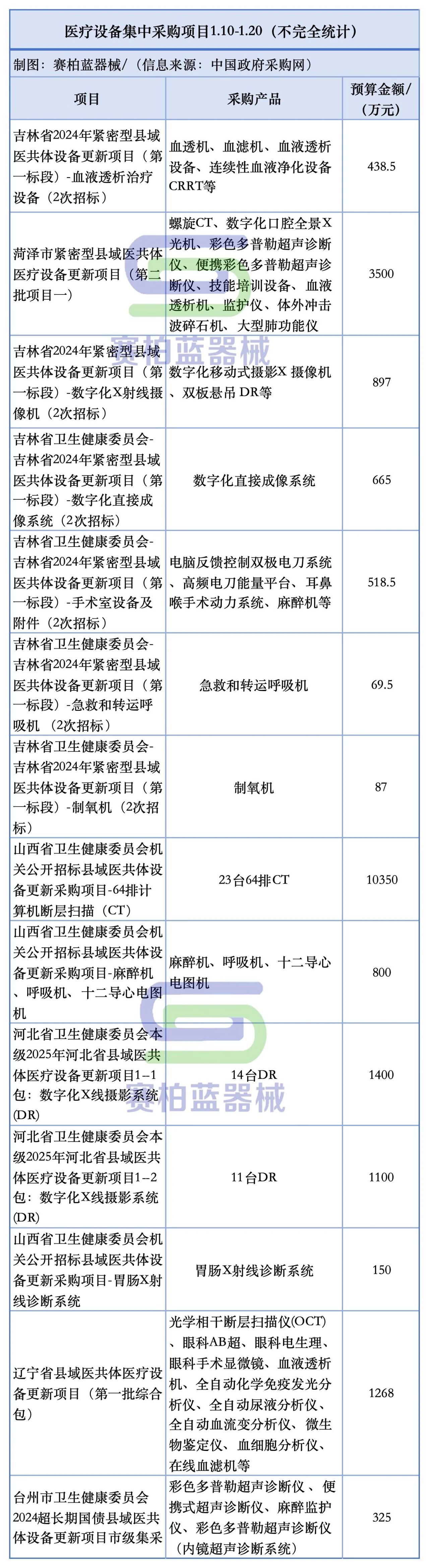 其中,山西省衛健委發布了多則縣域醫共體設備更新采購項目,采購64排CT、胃腸X射線診斷系統、麻醉機、呼吸機、十二導心電圖機等設備,總預算超1億元。