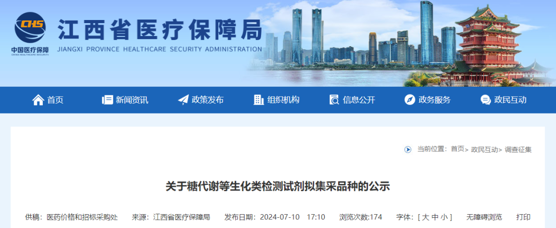7月10日,江西醫(yī)保局發(fā)布《關(guān)于糖代謝等生化類檢測(cè)試劑擬集采品種的公示》。