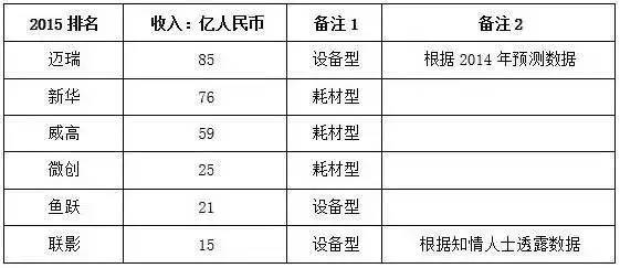 國內醫療器械企業六大巨頭在2015年的排名狀況,“三耗材”、“三設備”互拼