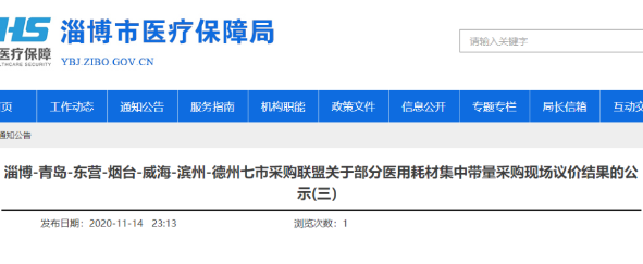 近日(11月14日),淄博市醫保局最新發布了一則《淄博-青島-東營-煙臺-威海-濱州-德州七市采購聯盟關于部分醫用耗材集中帶量采購現場議價結果的公示(三) 》(以下簡稱《公示》)。
