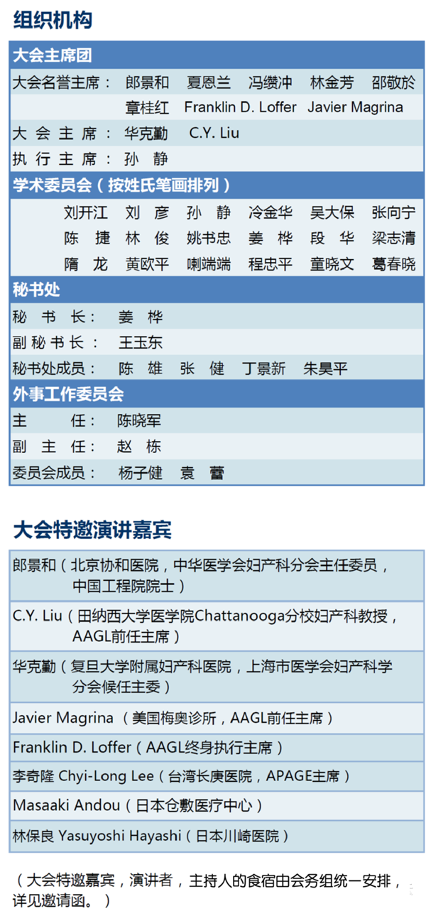 我們謹代表中美婦科內鏡高峰論壇組委會,誠摯地歡迎各位婦產科界同道參加2015年9月25-26日在上海國際會議中心召開的“中美婦科內鏡高峰論壇”(AAGL上海區域會議)!