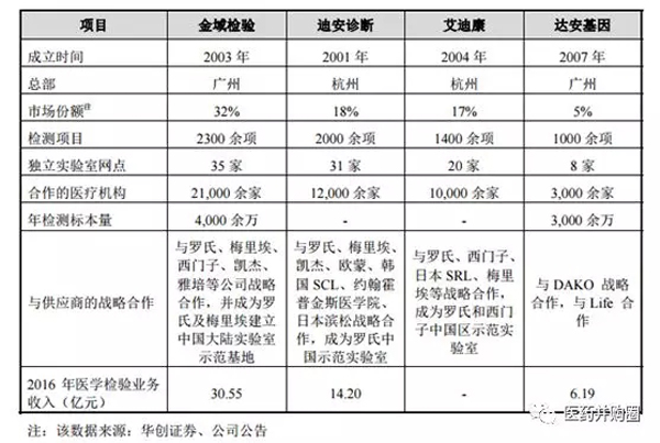 目前我國第三方醫(yī)學(xué)檢驗(yàn)市場呈寡頭壟斷的格局。據(jù)統(tǒng)計(jì),我國獨(dú)立醫(yī)學(xué)實(shí)驗(yàn)室已近 500 家,但大部分規(guī)模較小、區(qū)域性經(jīng)營,或?qū)W⒂谔厣珯z驗(yàn)項(xiàng)目,而金域檢驗(yàn)、艾迪康、迪安診斷和達(dá)安基因是實(shí)行全國連鎖經(jīng)營且規(guī)模較大的綜合性獨(dú)立醫(yī)學(xué)實(shí)驗(yàn)室,上述四家公司合計(jì)約占半數(shù)以上的市場份額。