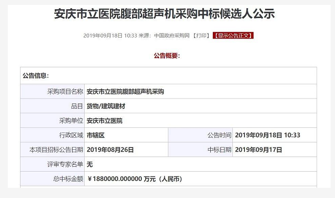 同是今天(9月18日),中國政府采購網(wǎng)發(fā)布《安慶市立醫(yī)院腹部超聲機(jī)采購中標(biāo)候選人公示》,顯示總中標(biāo)金額為188萬元。