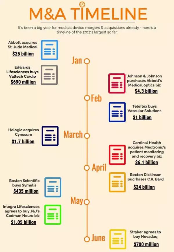 對(duì)于醫(yī)療器械行業(yè)而言,2017年注定是忙碌的一年。在過去的短短6個(gè)月,該領(lǐng)域已發(fā)生了數(shù)宗巨額交易,例如雅培制藥250億美元收購心臟設(shè)備制造商圣猶達(dá)醫(yī)療,貝克頓-迪金森240億美元收購巴德醫(yī)療科技公司;康德樂61億美元收購美敦力旗下醫(yī)療用品業(yè)務(wù)。