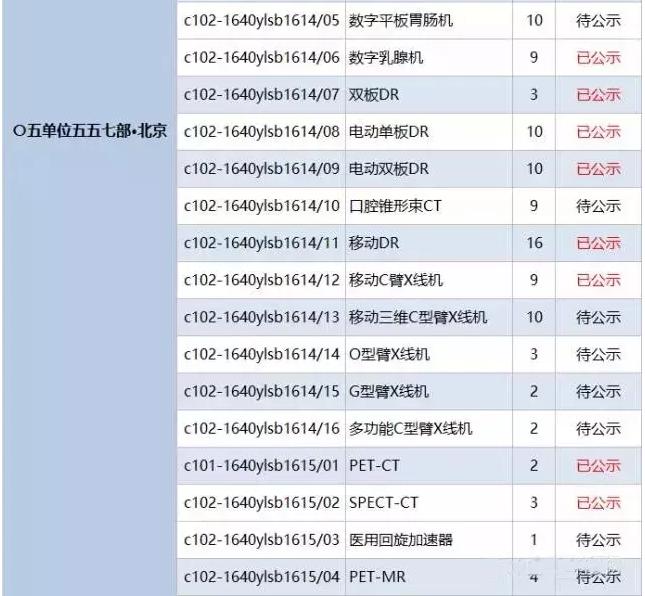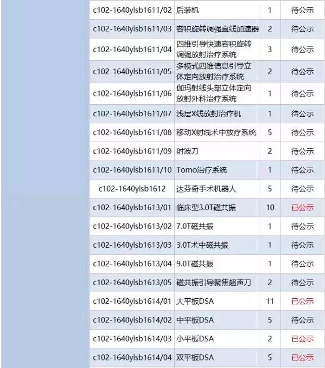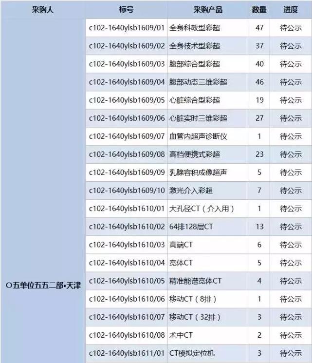 據悉,2017年1月,《2016年度軍隊醫療設備國際招標公告》陸續發布,據統計醫療設備需求數量合計454臺(其中38臺CT;23臺DSA;13臺MRI,其中含7.0T、9.0T各一臺;5臺達芬奇手術機器人),這意味如今軍隊醫療設備尚有364臺招標結果未出,具體招標的醫療設備都有那些呢?中標人將會是誰呢?我們拭目以待。