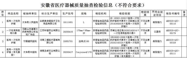 其中,在太和縣人民醫(yī)院抽樣的,標(biāo)示為合肥美迪普醫(yī)療衛(wèi)生用品有限公司生產(chǎn)的醫(yī)用一次性防護(hù)服,生產(chǎn)批號(hào)18111601,規(guī)格L;寧國(guó)健民醫(yī)院抽樣的,標(biāo)示為河南三耀醫(yī)療器械有限公司生產(chǎn)的醫(yī)用一次性防護(hù)服,生產(chǎn)批號(hào)20052701,規(guī)格連身式180;太和縣中醫(yī)院抽樣的,標(biāo)示為湖南迅卓實(shí)業(yè)有限公司生產(chǎn)的醫(yī)用一次性防護(hù)服(非無(wú)菌型),生產(chǎn)批號(hào)20200417,規(guī)格Conjoined/170;均斷裂強(qiáng)力不符合要求。