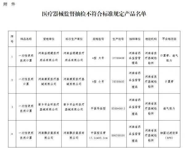 1.河南益德健醫(yī)療用品有限公司生產(chǎn)的1批次一次性使用醫(yī)用口罩,規(guī)格型號(hào):A型大號(hào),生產(chǎn)日期:2020年4月8日,生產(chǎn)批號(hào):37200408,不合格項(xiàng)目:口罩帶、通氣阻力。