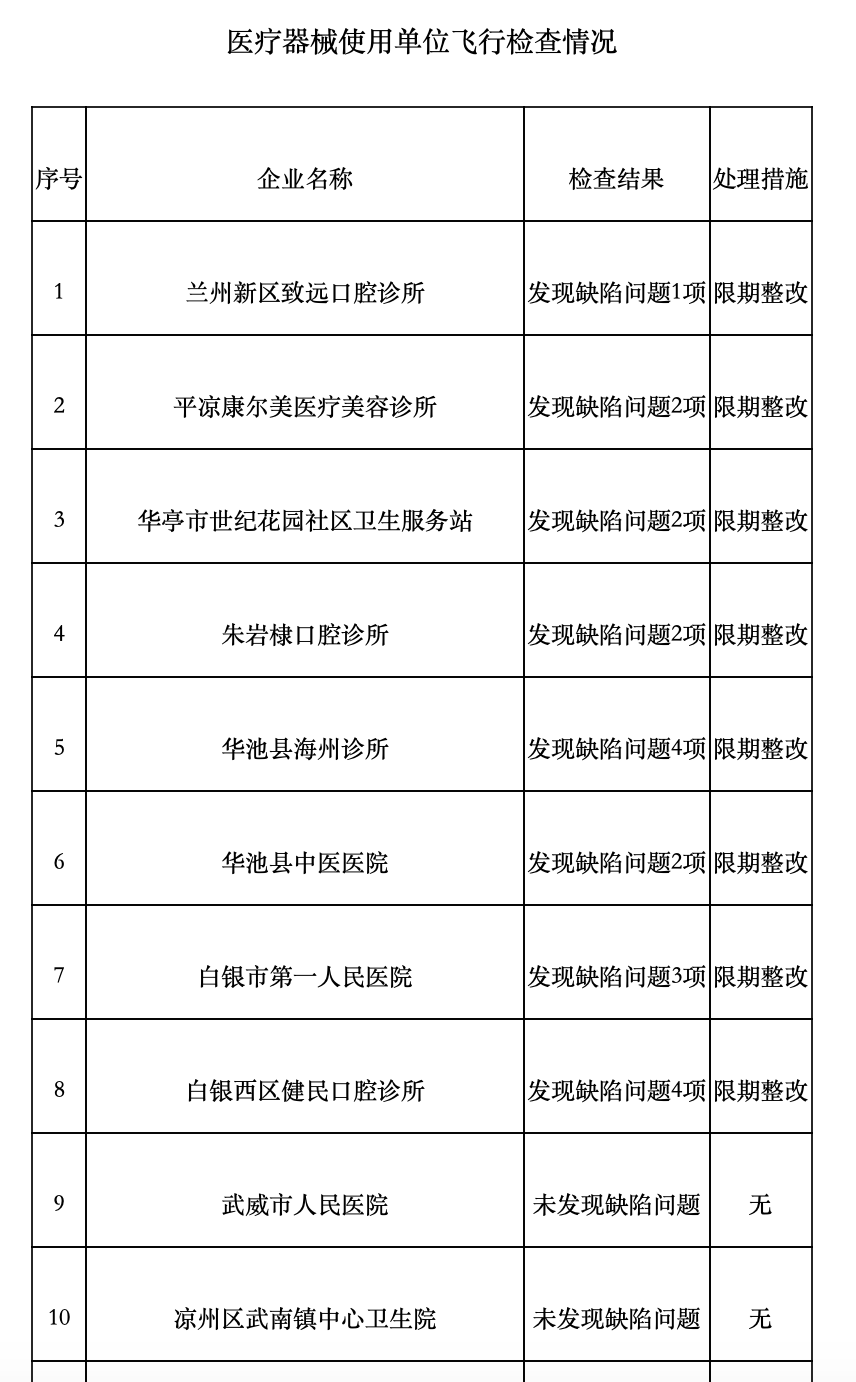 12月11日, 甘肅省藥品監(jiān)督管理局網(wǎng)站發(fā)布的《關(guān)于2020年度部分醫(yī)療器械使用單位飛行檢查情況的通告》顯示,根據(jù)《醫(yī)療器械監(jiān)督管理?xiàng)l例》《醫(yī)療器械使用質(zhì)量監(jiān)督管理辦法》等法規(guī)、規(guī)章規(guī)定,2020年11月16日-11月25日,甘肅省藥品監(jiān)督管理局組織檢查組對(duì)省內(nèi)部分醫(yī)療器械使用單位進(jìn)行了飛行檢查。