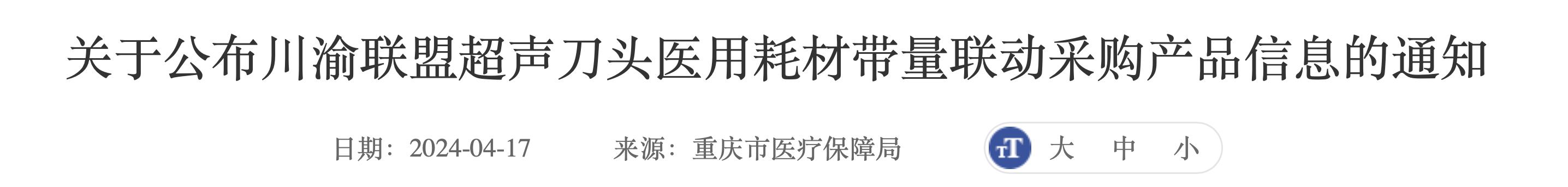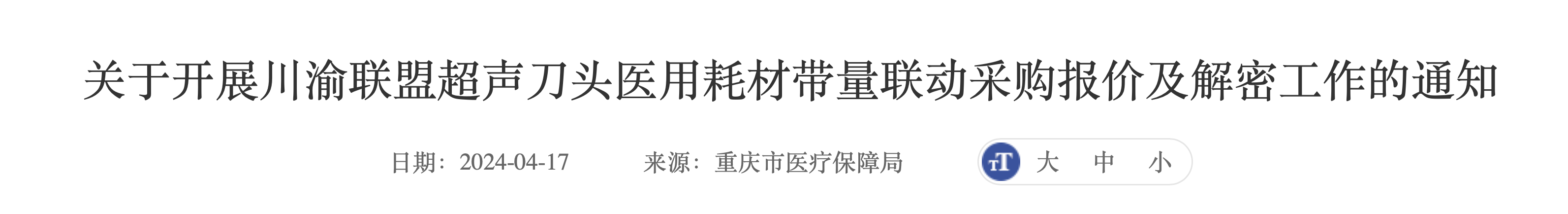 4月17日,重慶市醫保局連發三份文件,分別為《關于開展川渝聯盟超聲刀頭醫用耗材帶量聯動采購報價及解密工作的通知》《關于公布川渝聯盟超聲刀頭醫用耗材帶量聯動采購產品信息的通知》《關于公布川渝聯盟超聲刀頭醫用耗材帶量聯動采購需求量的通知》。