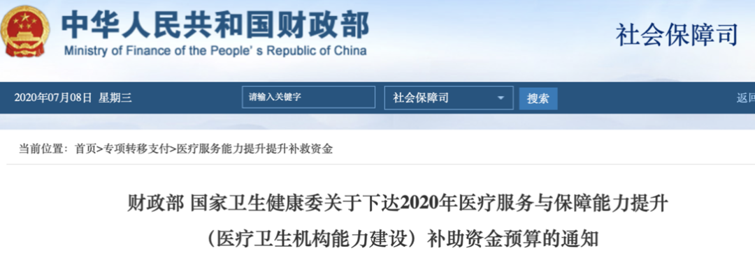 財政部與國家衛生健康委發布《關于下達2020年醫療服務與保障能力提升(醫療衛生機構能力建設)補助資金預算的通知》,對各個省份的資金做了公示。