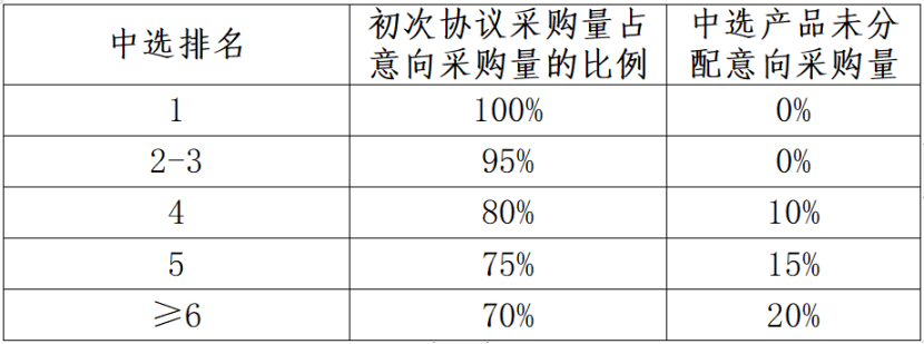 第一步:按中選排名確定初次協議采購量,初次協議采購量占意向采購量的比例見下表。根據醫療機構的意向采購量,四舍五入取整,計算各品種各企業的初次協議采購量。