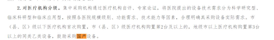 市(縣、區(qū))級以下醫(yī)療機構首次購置,市(縣、區(qū))級醫(yī)療機構購置第2臺及以上的,地級市以上醫(yī)療機構購置第3臺以上的同類乙類設備,鼓勵采購國產(chǎn)設備。