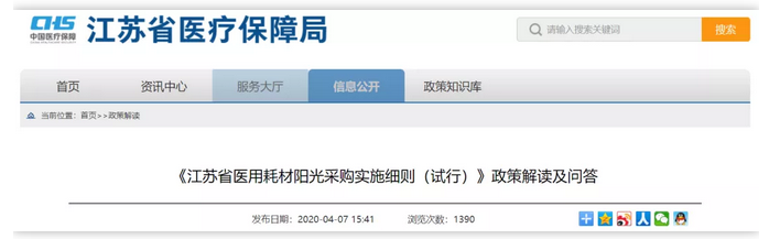 4月7日,江蘇醫保局發布《<江蘇省醫用耗材陽光采購實施細則(試行)>政策解讀及問答》(下稱《解讀》顯示,高值耗材價格必須是全國最低價。