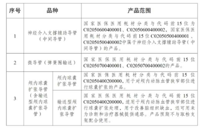 本輪集中帶量采購品種包括神經介入支撐輔助導管(中間管)、微導管(彈簧圈輸送)、顱內球囊擴張導管(含型顱內球囊擴張導)。