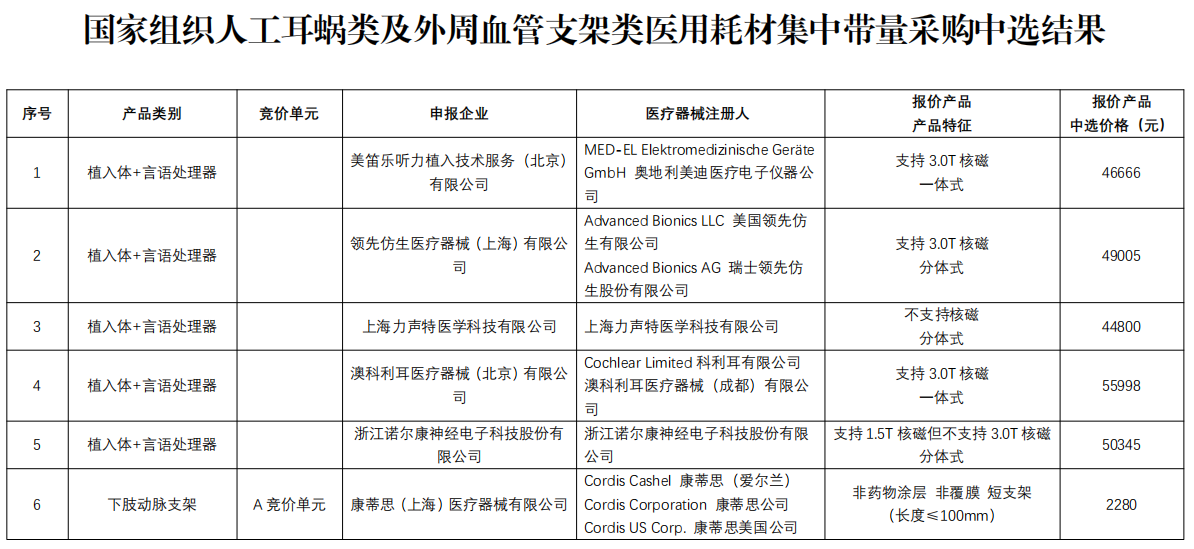 同時(shí),在規(guī)則一未能中選的外資企業(yè),復(fù)活機(jī)制啟動(dòng)后,也以積極姿態(tài)入選。以人工耳蝸全球頭部企業(yè)之一的澳科利耳為例,首輪競(jìng)標(biāo)中雖未能入選。但在隨后的二輪報(bào)價(jià)中,科利耳成功“復(fù)活”,包括其Kanso 2一體機(jī)以及3.0T核磁兼容的CI622植入體在內(nèi)的全線產(chǎn)品均已成功入圍。