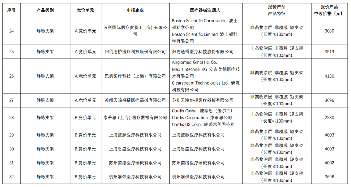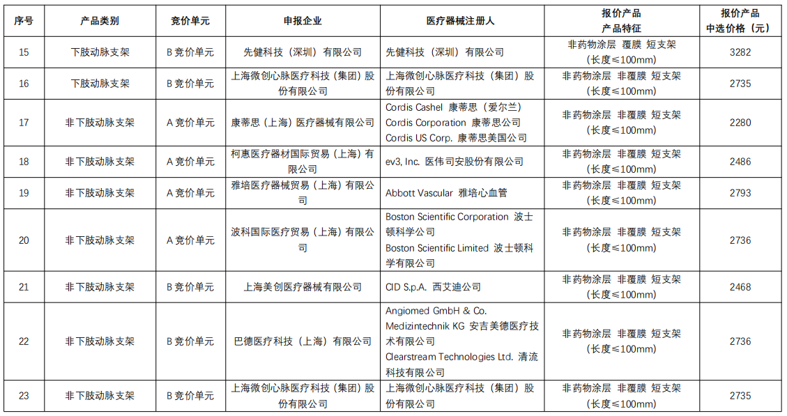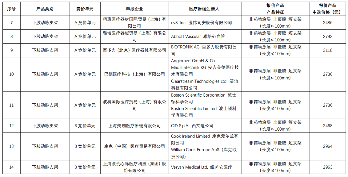 下肢動(dòng)脈支架:庫(kù)克醫(yī)療、維芮安醫(yī)療通過規(guī)則二中選,巴德醫(yī)療、波科、先鋒科技、心脈醫(yī)療通過規(guī)則三中選;非下肢動(dòng)脈支架:巴德醫(yī)療通過規(guī)則二中選,波科、心脈醫(yī)療通過規(guī)則三中選;靜脈支架:藍(lán)脈醫(yī)療、恩盛醫(yī)療、茵絡(luò)醫(yī)療通過規(guī)則二中選,天鴻盛捷、唯強(qiáng)醫(yī)療、安泰生物規(guī)則三中選。