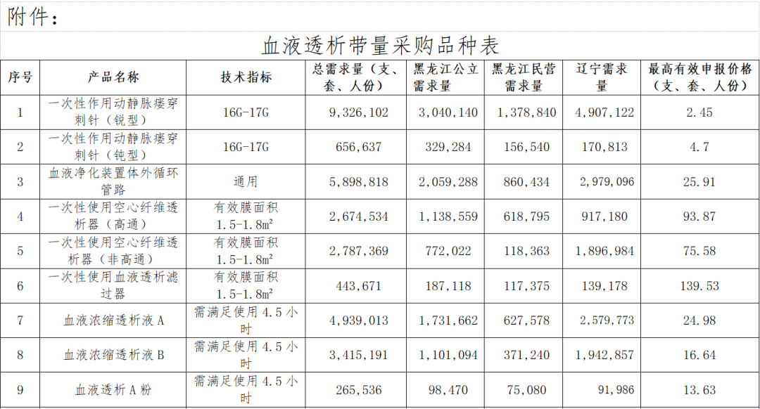 血液透析各品種總需求量及最高有效申報價格如下: