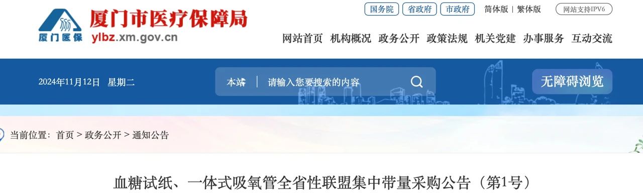 11月11日,福建省廈門市醫(yī)保局發(fā)布《血糖試紙、一體式吸氧管全省性聯(lián)盟集中帶量采購公告(第1號)》和《血糖試紙、一體式吸氧管全省性聯(lián)盟集中帶量采購公告(第2號)》。