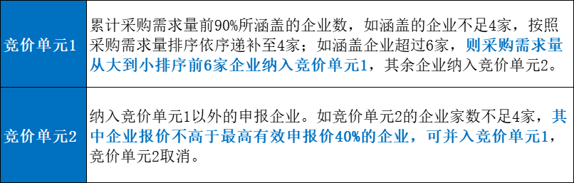在競價單元2中,淘汰本競價單元企業(yè)排名后50%的企業(yè),其余企業(yè)獲得擬中選資格。若競價單元2取消,未并入競價單元1的企業(yè)直接淘汰。