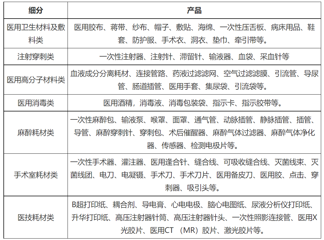 低值醫(yī)用耗材主要是指醫(yī)療服務過程中經(jīng)常使用的一次性衛(wèi)生材料,可分為醫(yī)用衛(wèi)生材料及敷料類、注射穿刺類、醫(yī)用高分子材料類、醫(yī)用消毒類、麻醉耗材類、手術室耗材類和醫(yī)技耗材類。