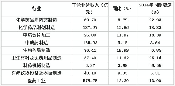 2015年一季度醫(yī)藥工業(yè)主營業(yè)務(wù)收入完成情況