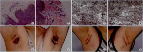 典型病例:患者女,25歲,因行雙側腋窩腫物切除術后導致瘢痕疙瘩要求行手術治療,經檢查確定具備適應證后, 預約在門診手術室行雙側腋部瘢痕切除、拉攏縫合術,術中右側予射頻刀切除,左側予手術刀切除。術后1周,雙側腋窩傷品均無紅腫、滲出,愈合良好,無皮下血腫,瘢痕較明顯; 術后1個月,雙側腋窩瘢痕無紅腫,左側較明顯,輕微色素沉著;術后半年隨訪,患者因未遵醫囑行同位素放射治療,雙側腋窩瘢痕輕度增生,但兩側無明顯差別,且均較術前有明顯改善,患者對治療效果滿意(如圖5-8)。