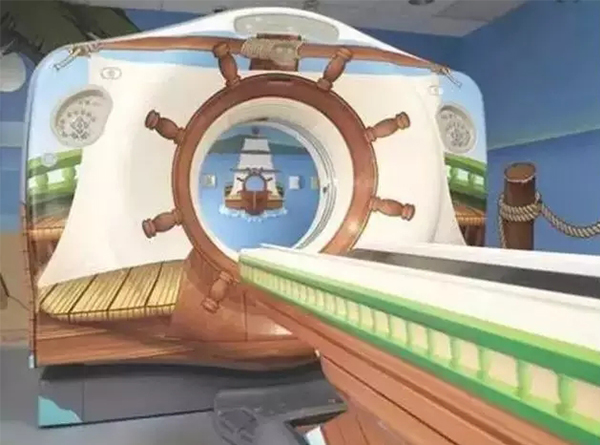 這些創(chuàng)意設計,發(fā)達國家比我們走得前一些。下圖為GE公司和美國曼哈頓某醫(yī)院共同設計的一款兒童核磁共振器,外觀墻壁粉刷都用了海洋的元素。該設備投入使用后,甚至很多17到21歲的病人也要求使用這款機器進行檢查。