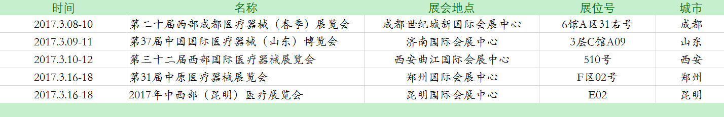 日前,為期半個月的五個展會相繼圓滿結(jié)束 !! 分別是“第二十屆西部成都醫(yī)療器械(春季)展覽會”、“第37屆中國國際醫(yī)療器械(山東)博覽會”、“第三十二屆西部國際醫(yī)療器械展覽會”、“第31屆中原醫(yī)療器械展覽會”、以及“2017年中西部(昆明)醫(yī)療展覽會” 。詳細時間地點見下表