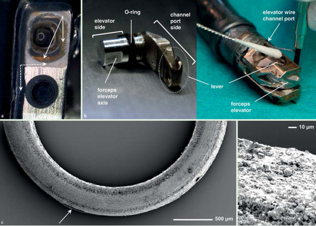 一組感染內鏡部分拆卸零件的電子顯微照片顯示,內鏡鏡蓋靠近物鏡部分有裂痕,幾個內鏡部件表面可見棕色染色的污垢