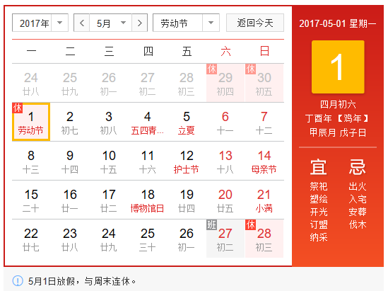 根據(jù)《國(guó)務(wù)院辦公廳關(guān)于2017年部分節(jié)假日安排的通知》,現(xiàn)將公司2017年五一放假的有關(guān)事宜通知如下: