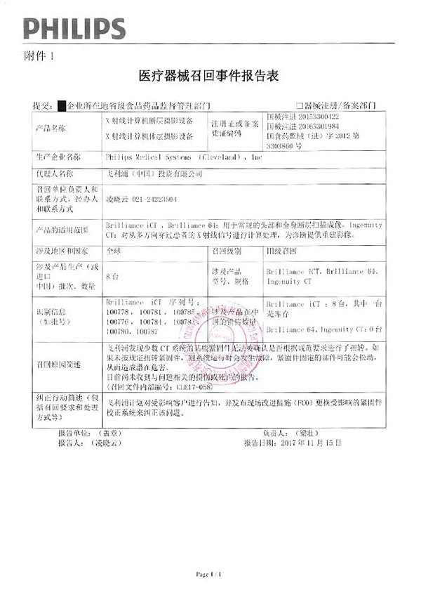 飛利浦(中國)投資有限公司報告,涉及產(chǎn)品某些緊固件無法被確認(rèn)是否根據(jù)規(guī)范要求進行了扭轉(zhuǎn),如果未按規(guī)定扭轉(zhuǎn)緊固件,則系統(tǒng)運行時會發(fā)生故障,緊固件固定的部件可能會松動,從而造成潛在危害。飛利浦(中國)投資有限公司對X射線計算機斷層攝影設(shè)備(注冊證號:國械注進20153300422、國食藥監(jiān)械(進)字2012第3303860)、X射線計算機體層攝影設(shè)備(注冊證號:國械注進20163301984、)主動召回。召回級別為三級。涉及產(chǎn)品的型號、規(guī)格及批次等詳細(xì)信息見《醫(yī)療器械召回事件報告表》。