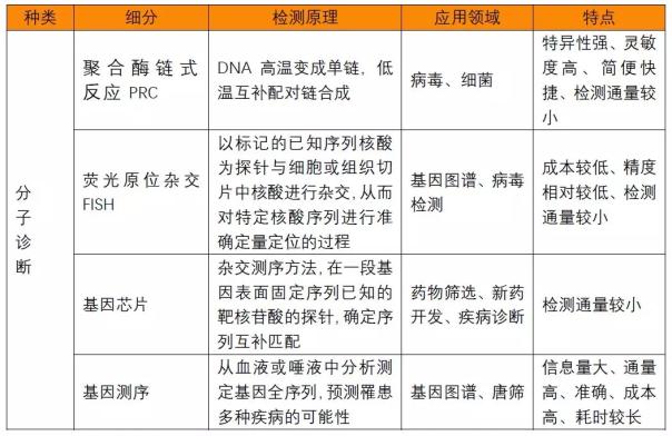 分子診斷主要是應用分子生物學方法檢測生物體內遺傳物質的結構或表達水平的變化而做出診斷的技術。由于分子診斷可以從基因層次進行檢測,因此檢測靈敏度和準確性的優勢較為明顯,可在感染初期識別病毒或者提早確認基因缺陷,從而提供個性化的醫療診斷服務,主要應用于遺傳病、傳染性疾病、腫瘤等疾病的檢測與診斷。分子診斷主要包括核酸診斷和生物芯片技術。