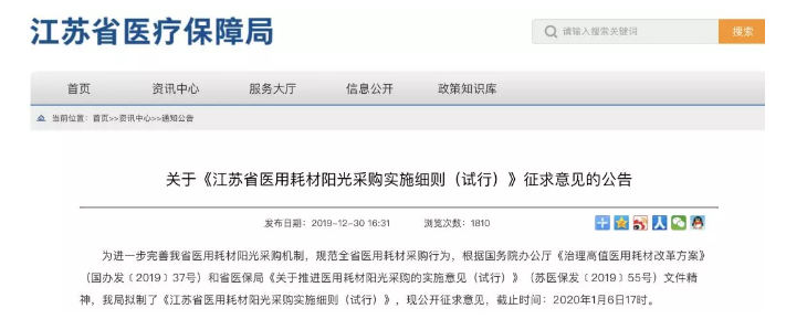 12月30日,江蘇省醫(yī)療保障局印發(fā)關(guān)于征求《江蘇省醫(yī)用耗材陽光采購實施細(xì)則(試行)》意見的通知,此規(guī)定根據(jù)國務(wù)院辦公廳《治理高值醫(yī)用耗材改革方案》和《關(guān)于推進(jìn)醫(yī)用耗材陽光采購的實施意見(試行)》文件精神制定。