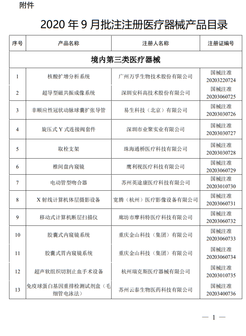 上述公告顯示,2020年9月,國(guó)家藥品監(jiān)督管理局共批準(zhǔn)注冊(cè)醫(yī)療器械產(chǎn)品86個(gè)。其中,境內(nèi)第三類醫(yī)療器械產(chǎn)品53個(gè),進(jìn)口第三類醫(yī)療器械產(chǎn)品16個(gè),進(jìn)口第二類醫(yī)療器械產(chǎn)品17個(gè)。