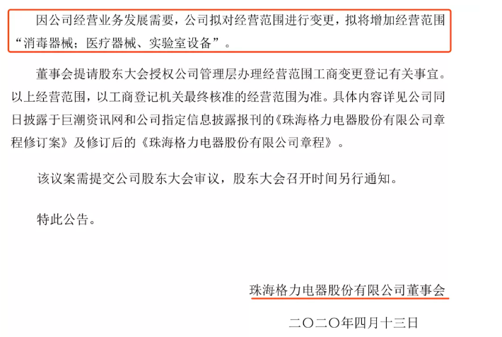 4月13日,格力電器發布公告,因公司經營業務發展需要,公司擬對經營范圍進行變更,擬將增加經營范圍 “消毒器械 ; 醫療器械、實驗室設備”。