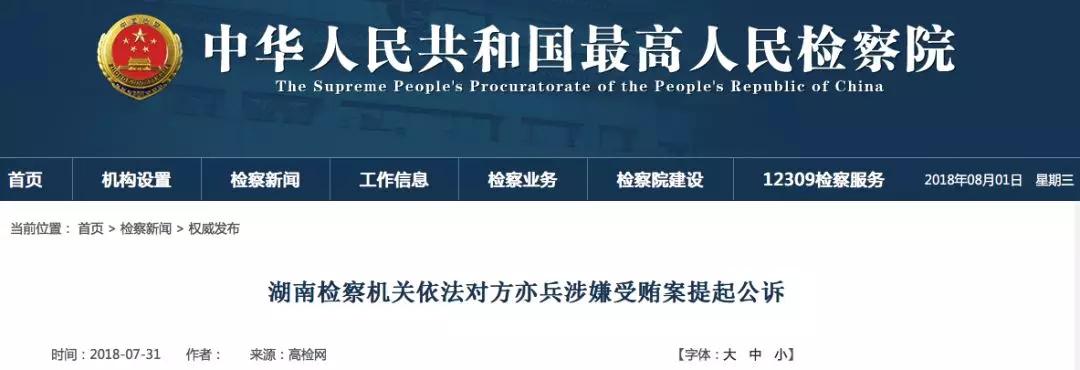 緊接著7月31日,據最高人民檢察院消息,湖南省衛計委原黨組成員、副主任方亦兵(副廳級)涉嫌受賄罪一案,經湖南省人民檢察院指定管轄,近日由株洲市人民檢察院向株洲市中級人民法院提起公訴。