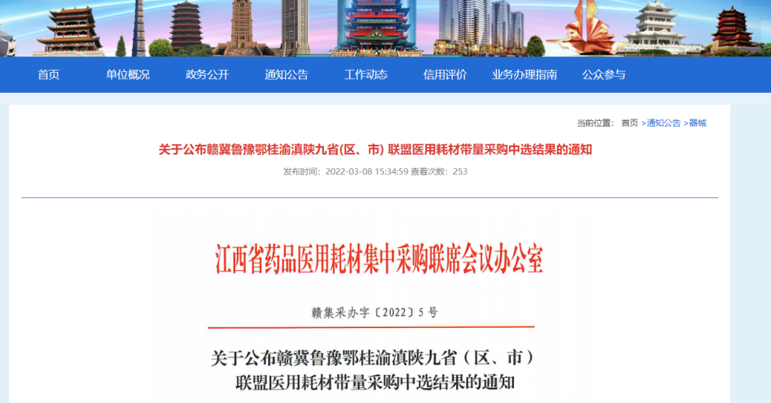今天,江西省藥品醫用耗材集中采購聯席會議辦公室公布了《關于公布贛冀魯豫鄂桂渝滇陜九省(區、市) 聯盟醫用耗材帶量采購中選結果的通知》(以下簡稱通知)。