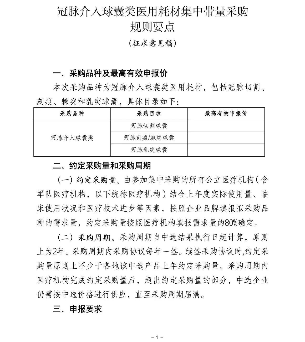 根據《意見稿》,此次采購品種為冠脈介入球囊類耗材,包括冠脈切割、刻痕、棘突和乳突球囊,最高有效申報價暫未公布。