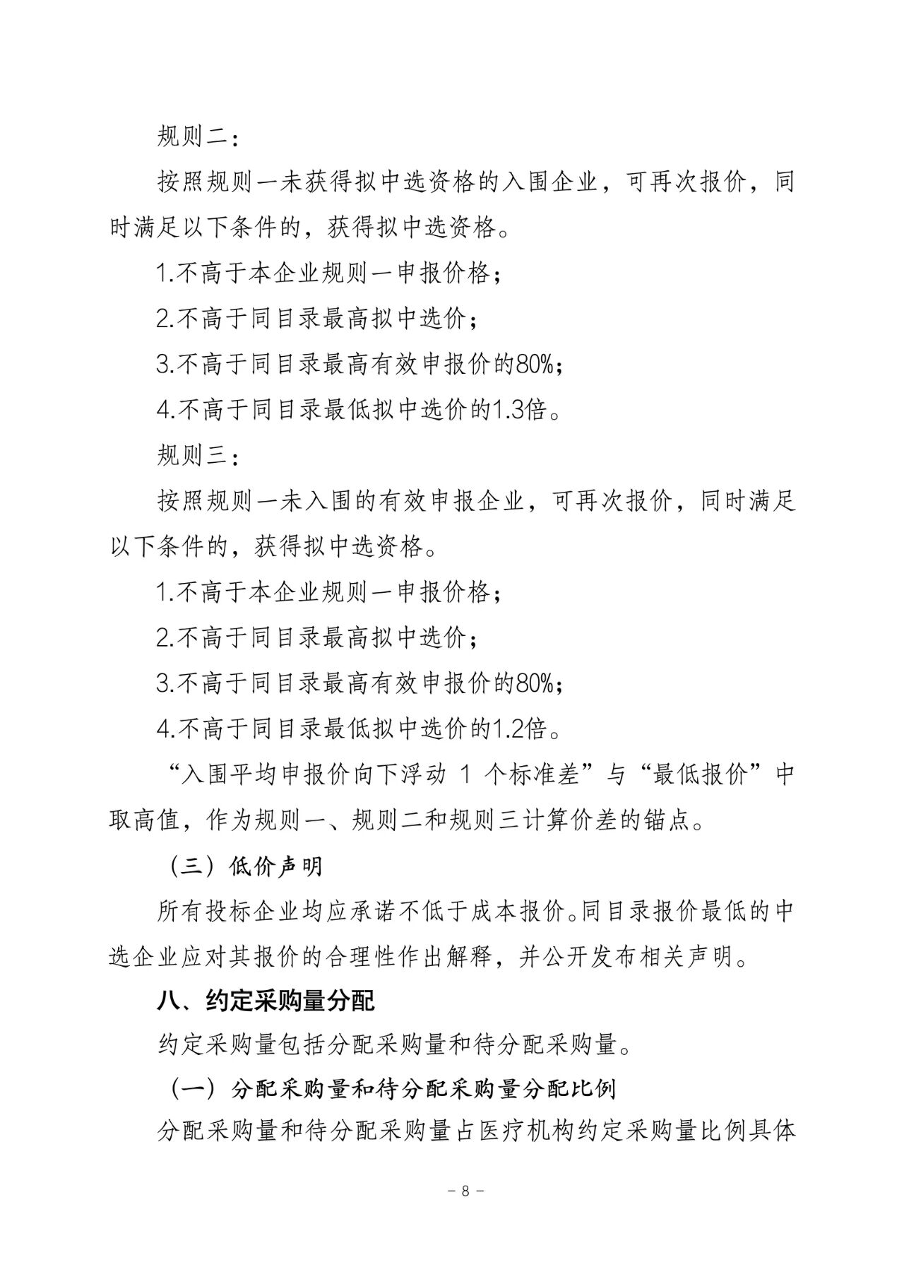 按照規則一未入圍的有效申報企業,可再次報價,同時滿足不高于本企業規則一申報價格、同目錄最高擬中選價、同目錄最高有效申報價的80%,同目錄最低擬中選價的1.2倍這四個條件的,獲得擬中選資格。
