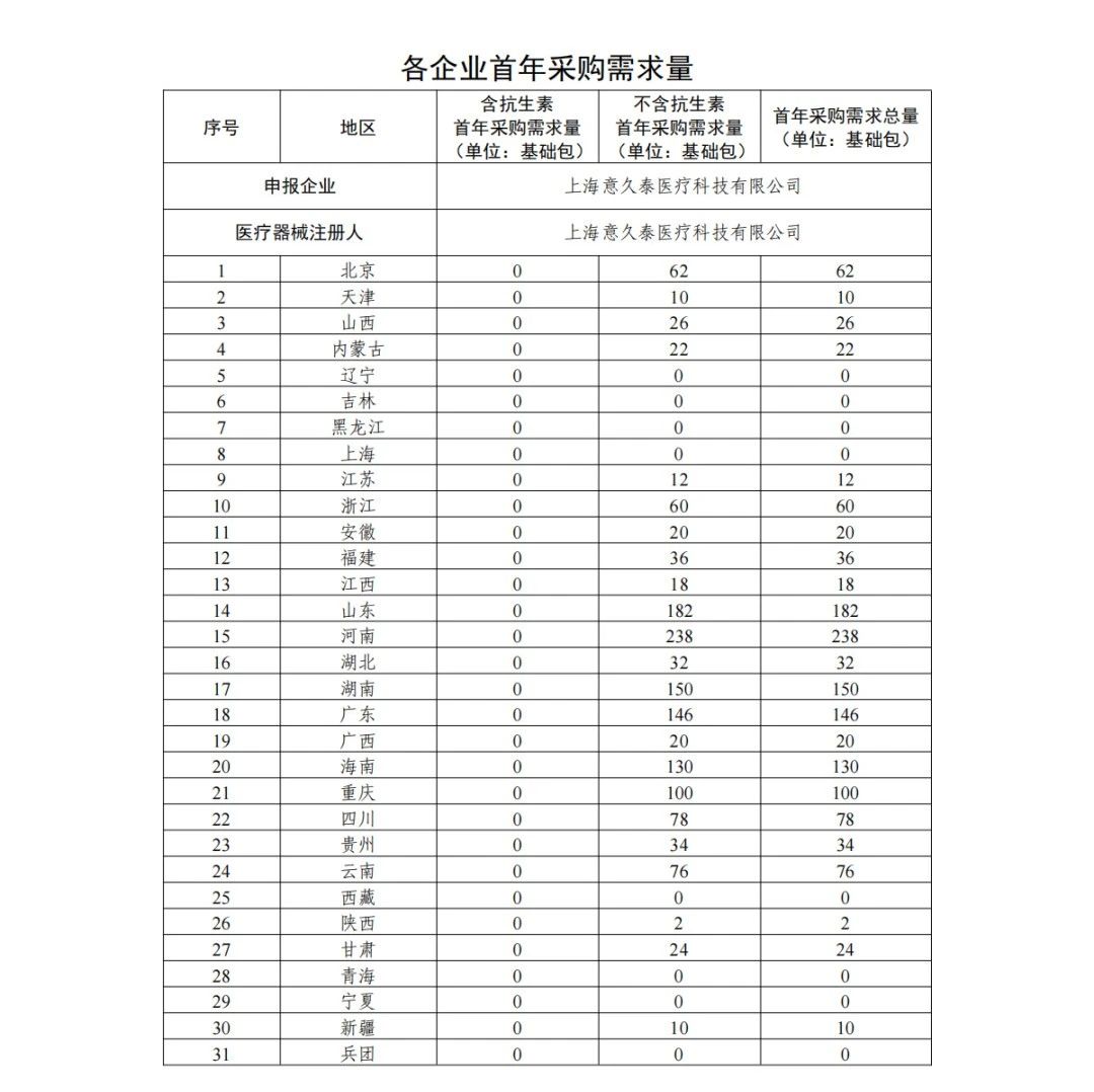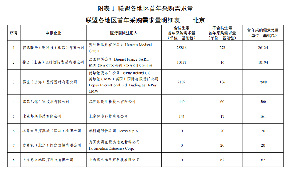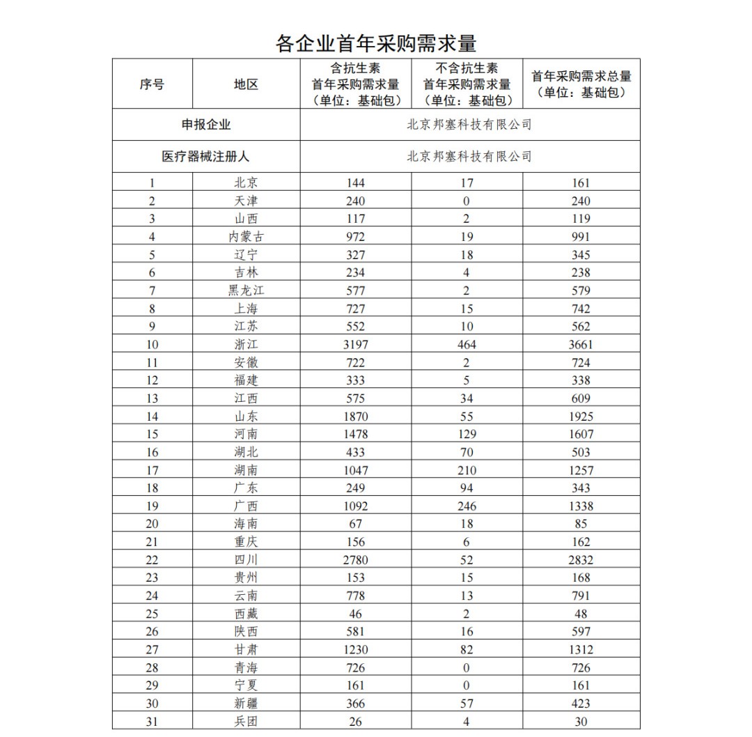 采購需求量方面,《采購文件》指出,首年采購需求量按參加本次集中帶量采購的每一家醫療機構報送的采購需求量累加得出,以 20g 粉末所對應的關節骨水泥產品為 1 個“基礎包”統計(不同包裝規格產品按粉劑重量等比例轉換為基礎包數量,如出現小數,則向下取整至個位)。