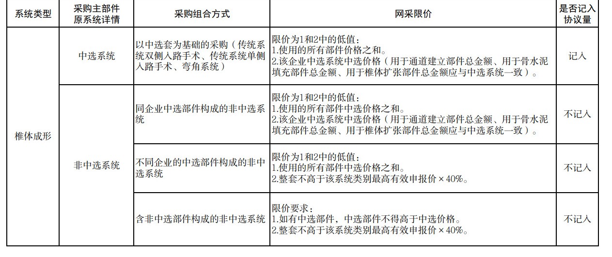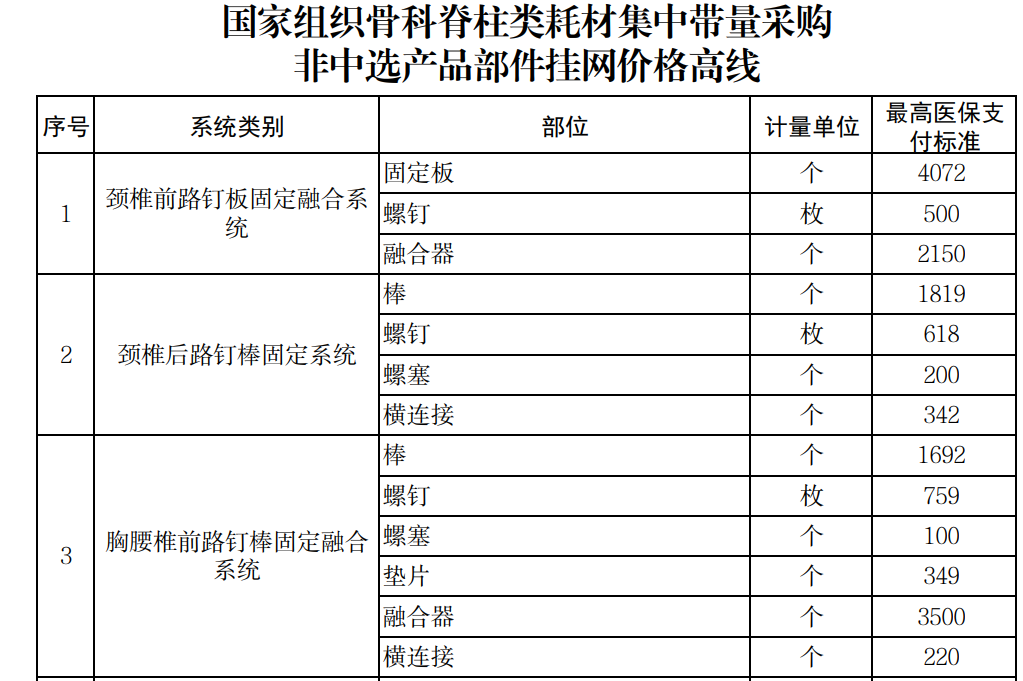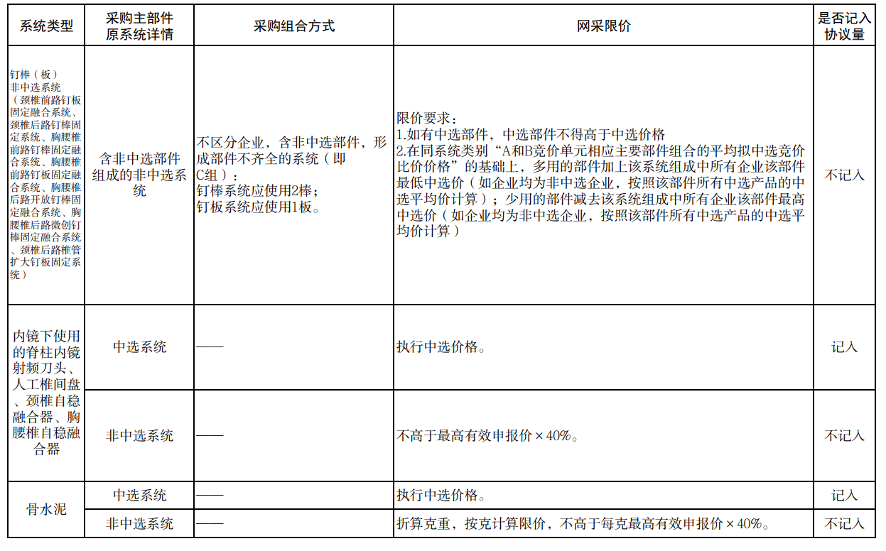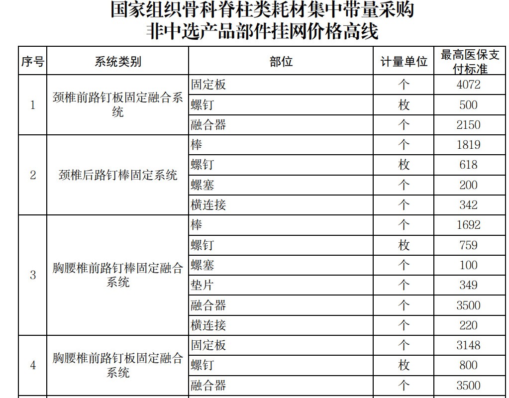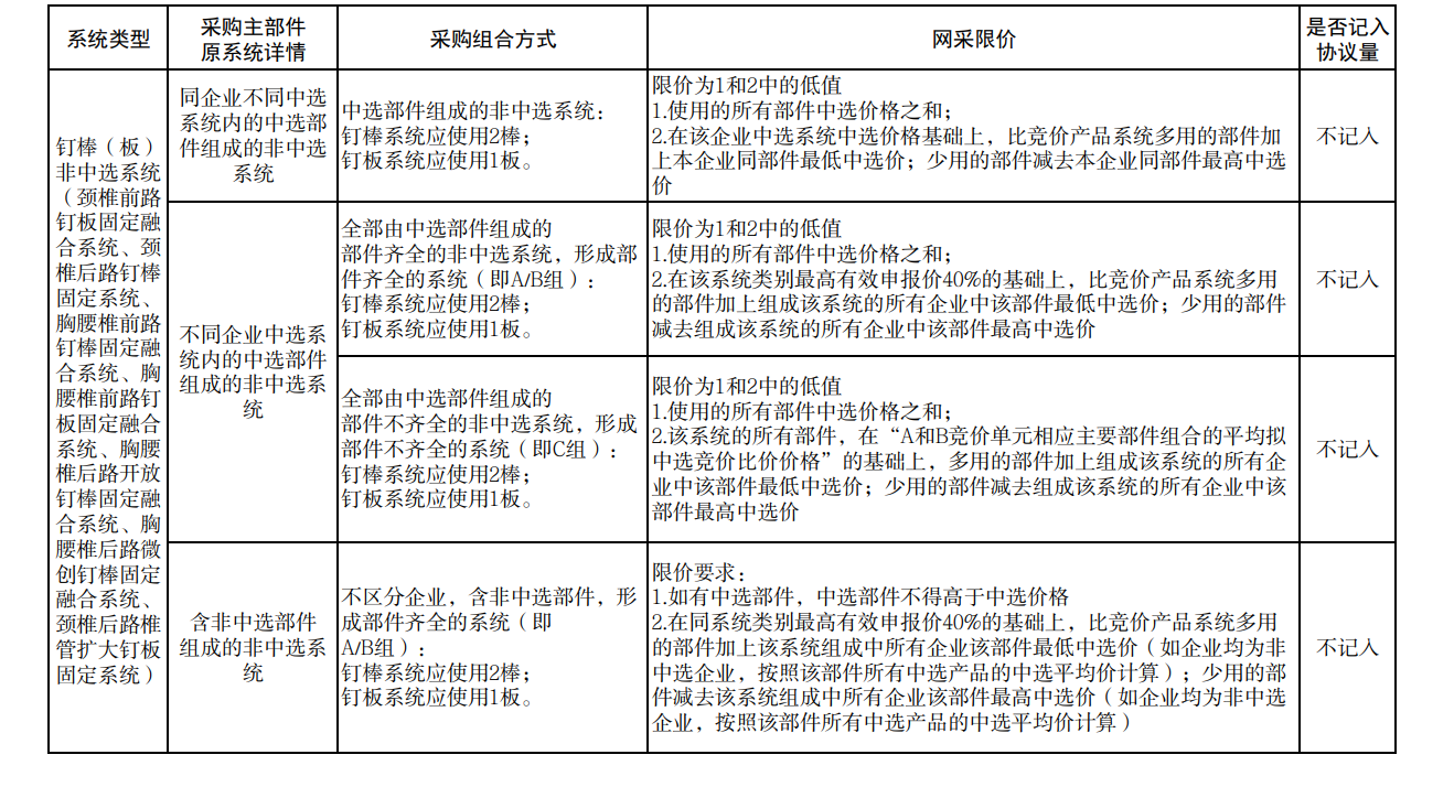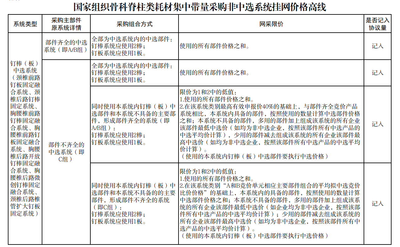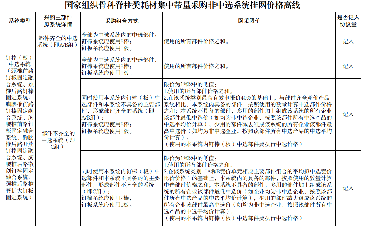 各中選企業(yè)的非中選產(chǎn)品系統(tǒng)中包含中選產(chǎn)品系統(tǒng)部件的,按不高于該部件的中選價(jià)格掛網(wǎng);如非中選脊柱產(chǎn)品各部件均由中選產(chǎn)品系統(tǒng)的不同部件組成,則總價(jià)按實(shí)際使用部件折算成中選產(chǎn)品系統(tǒng)價(jià)格后,不得高于同企業(yè)同類別中選產(chǎn)品價(jià)格。其他非中選產(chǎn)品系統(tǒng)及部件分別設(shè)定掛網(wǎng)價(jià)格高線。