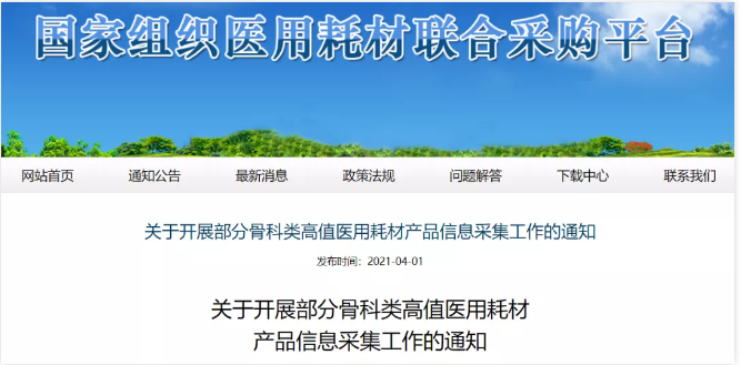 4月1日,國家組織醫(yī)用耗材聯(lián)合采購平臺發(fā)布《關(guān)于開展部分骨科類高值醫(yī)用耗材產(chǎn)品信息采集工作的通知》。
