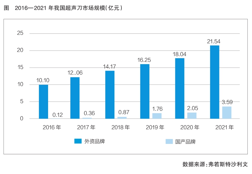 弗若斯特沙利文數據還顯示,我國超聲刀市場規模已從2016年的10.22億元增長至2021年的25.13億元,年復合增長率高達19.71%;其中,國產品牌市場規模增速較快,已從2016年的0.12億元增長至2021年的3.59億元(詳見圖)。