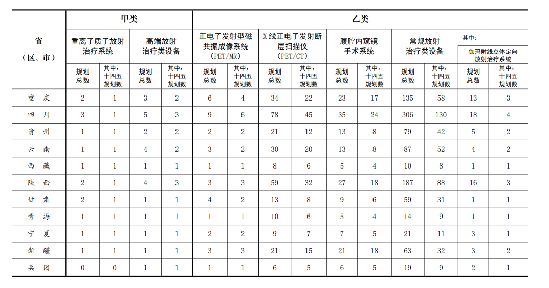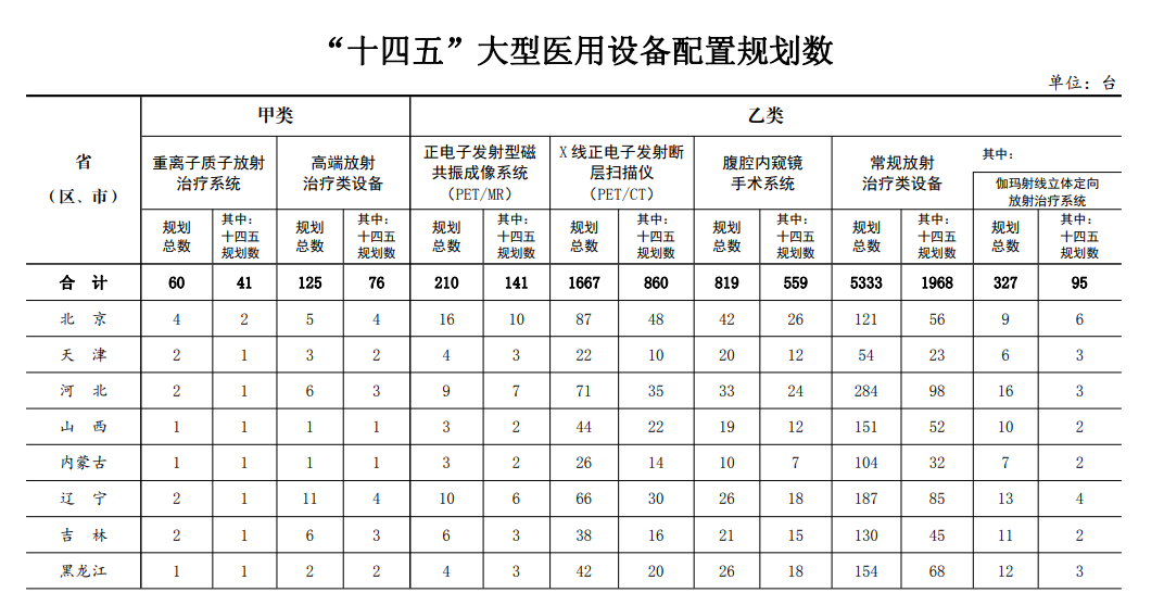 去年6月,國家衛(wèi)健委發(fā)布《關于“十四五”大型醫(yī)用設備配置規(guī)劃的通知》,公布了“十四五”期間全國大型醫(yī)用設備的配置規(guī)劃總量,以及各地的詳細分配情況。